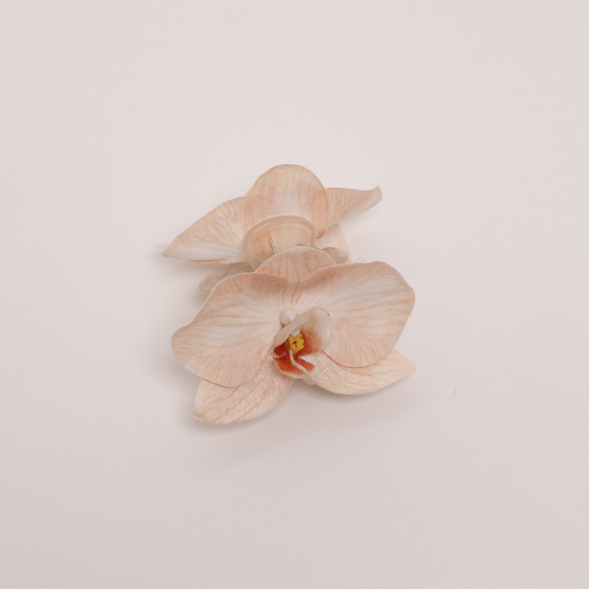 Handmade orchid hair clip in light peach, with two orchid flowers.