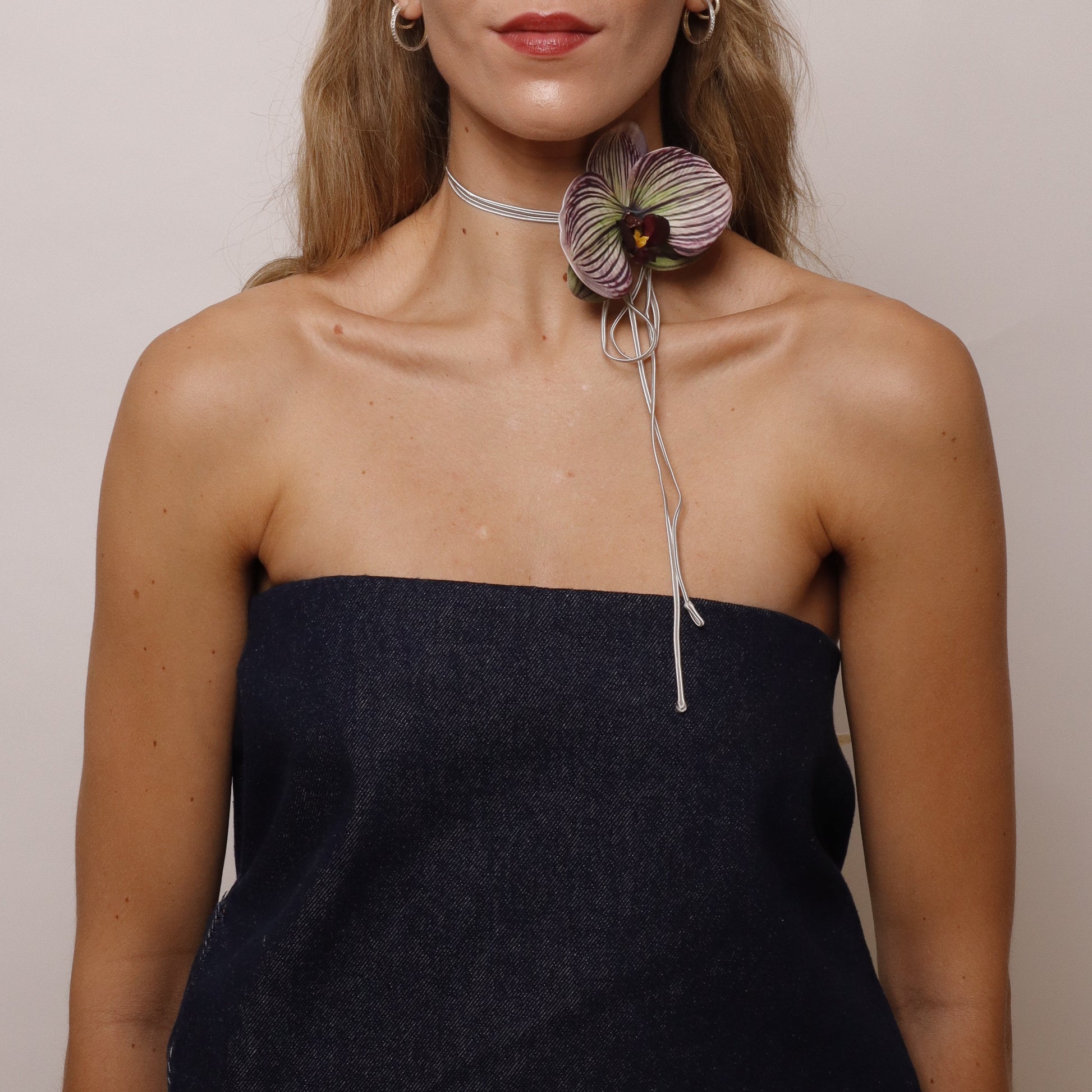 Handmade multifunctional floral cord with a mixed green/purple orchid and a silk cord of your choice.